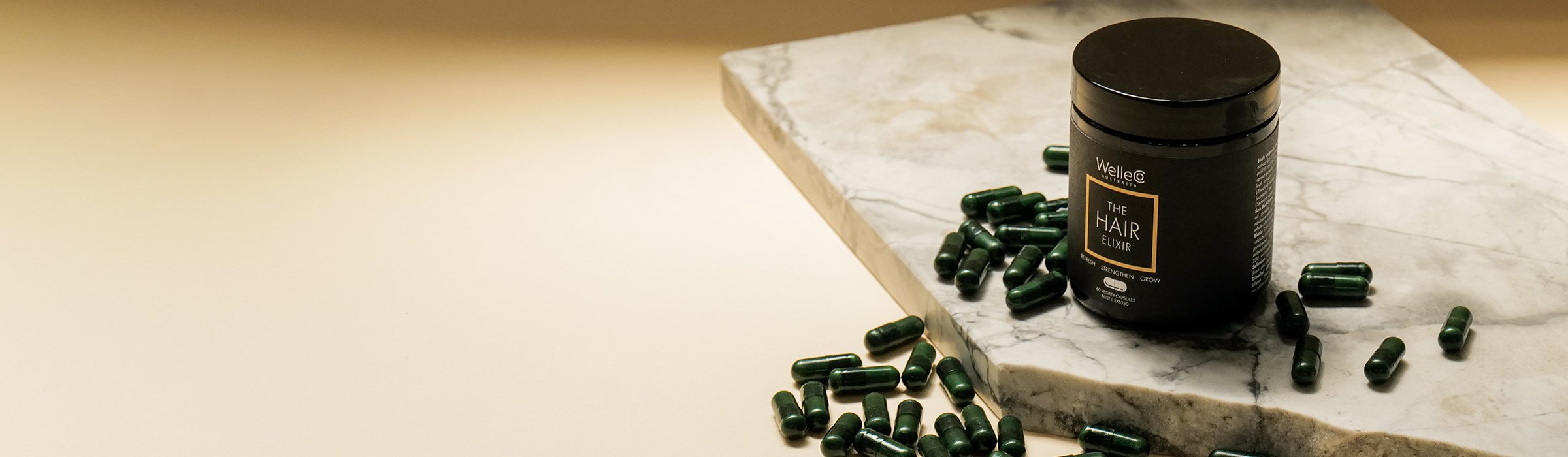 The Hair Elixir is a unique vegan formula that supports thicker, stronger hair with a blend of vitamins and minerals including biotin, amino acids, zinc, omega complex, Rhodiola, and iodine from organic seaweed. Taking two capsules daily will help support hair structural integrity, reduce breakage, promote healthy hair follicles, and encourage keratin formation.